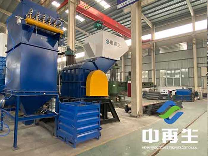 廢鋼鐵原料通過鏈板或皮帶輸送機運至進斜,進料斜面上裝有可轉動的一高一低的兩個碾壓滾筒將其壓扁并送入廢鋼破碎機內。在破碎機機體內,有多個固定在主軸上的圓盤及多個安在圓盤之間可以自由擺動的錘頭,高速旋轉產生的動能來對廢鋼鐵進行砸、撕、破碎處理,使廢鋼處理成團狀,可穿過下部或頂部的篩網,落入振動輸送機上。